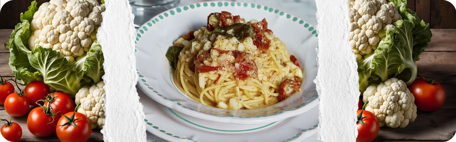 Escurre la coliflor y continúa la cocción en la cacerola con la cebolla. Añade un poco de pimienta, saltéala brevemente y luego incorpora un cucharón de agua hirviendo sin sal. Aplasta la coliflor con un tenedor de madera. Toma los tomates secos rehidratados, córtalos groseramente y agrégalos a la cacerola.