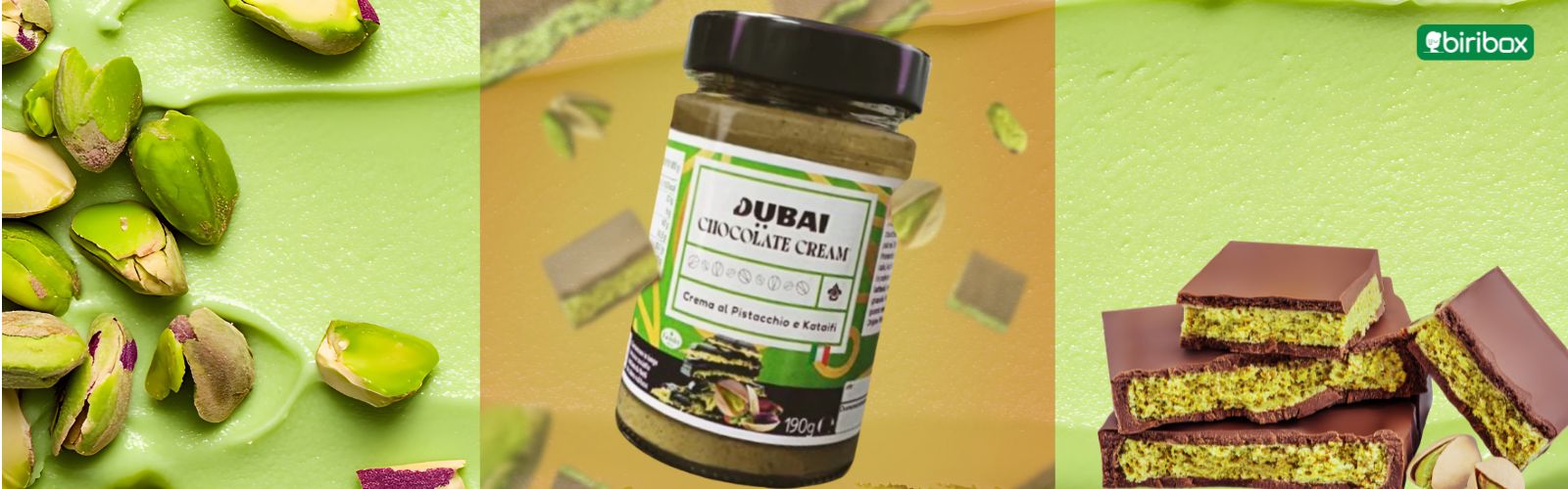 Il nostro Prodotto Stella della Settimana è la Crema Dubai al Cioccolato (190 g e 1 kg). Ma se il pistacchio è la tua passione, completa il tuo carrello con: Biscotto Baiocchi al Pistacchio 240 g, Macaron SENZA Glutine al Pistacchio 42 g, Pesto SENZA Glutine al Pistacchio Siciliano 500 g e Paté di Pistacchio Siciliano e Aglio 190 g.