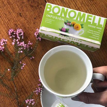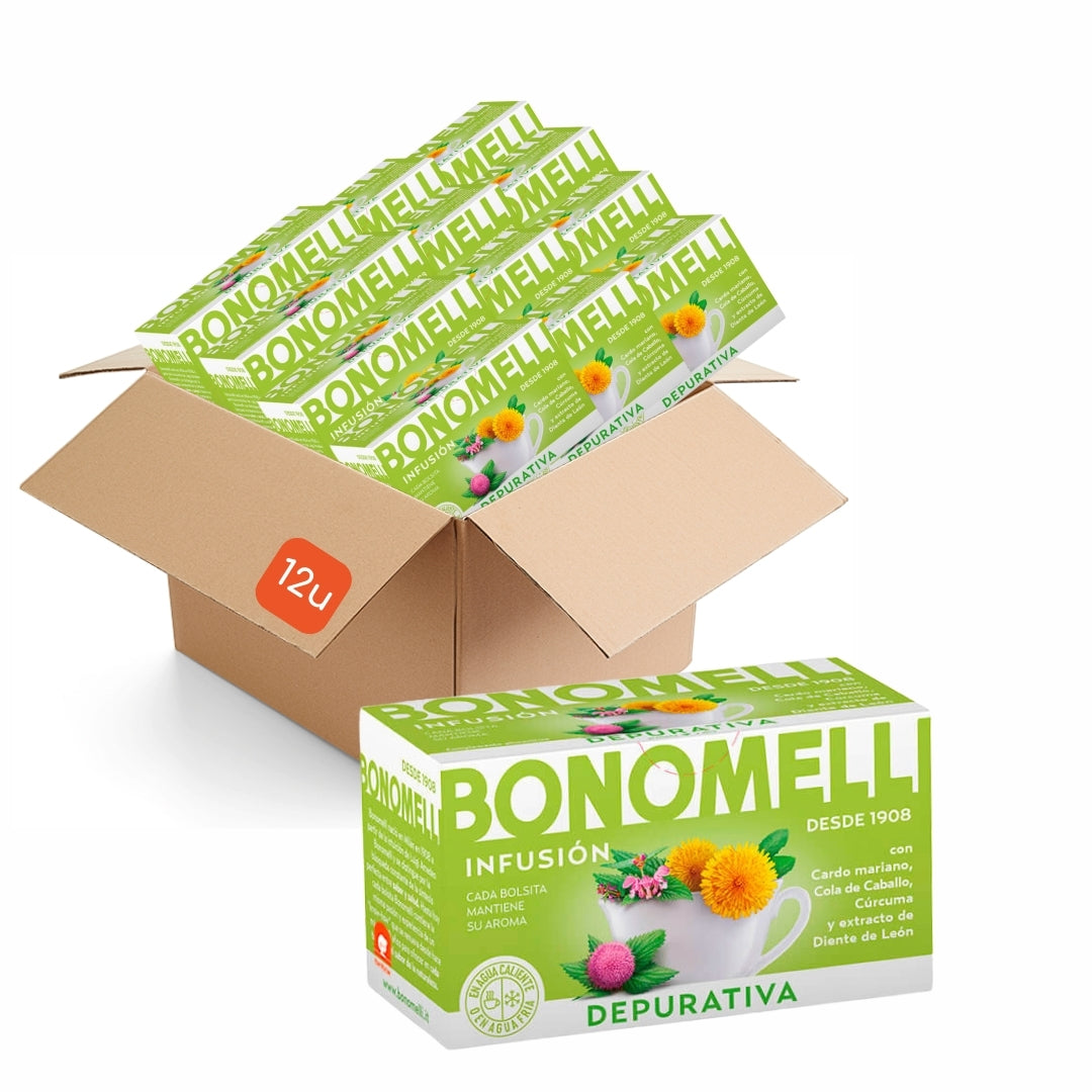 Características : A infusão de ervas Depurativa BONOMELLI é elaborada com os melhores ingredientes naturais para trazer um toque de harmonia e pureza ao seu corpo. A sua mistura com chá verde, cardo mariano e cavalinha promove processos de purificação do corpo para o ajudar a sentir-se melhor. As infusões BONOMELLI são perfeitas para consumir duas vezes ao dia e desfrutar de seu sabor e ótimas propriedades. Fazem parte de um estilo de vida saudável e de uma alimentação equilibrada.