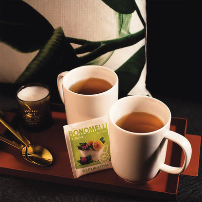 Infusão purificadora Bonomelli, com cavalinha, chá verde, camomila, açafrão, cardo mariano, dente de leão, sabugueiro, ideal com água quente ou fria, 16 filtros por 32 gr, 12 unidades por caixa